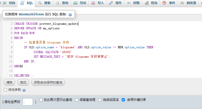 - 直接修改数据库:触发器只能阻止通过 SQL 语句修改blogname 字段。如果通过其他方式(如 PHPMyAdmin 或直接修改数据库文件)修改,触发器不会生效。